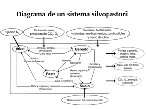 Figura 3. Diagrama simplificado de un sistema silvopastoril. Fuente: [12] Existe evidencia que demuestra que las fincas ganaderas pueden aportar al secuestro de carbono mediante la implementación de sistemas agroforestales; los bosques remanentes, áreas de vegetación secundaria en regeneración, pasturas arboladas y otros usos de la tierra dedicados a labores agrícolas pueden fungir como sumideros de carbono atmosférico (Post y Kwon 2000, Ruiz 2002, Fisher et ál. 2004). Los principales componentes de almacenamiento de carbono en el uso de la tierra son el carbono orgánico del suelo (COS) y en la biomasa arriba del suelo. Se ha estimado que el carbono (C) en la biomasa de los bosques primarios y secundarios varía entre 60 y 230 y entre 25 y 190 t ha-1, respectivamente (Brown et ál. 1997), y que el C en el suelo puede variar entre 60 y 115 t ha-1. Datos reportados de pasturas tropicales en Latinoamérica muestran cómo el establecimiento de pasturas mejoradas logra aumentar los niveles de carbono bajo el suelo. En Brasil, el establecimiento de pasturas mejoradas en áreas deforestadas provocó incrementos en la acumulación de carbono orgánico (De Camargo et ál. 1999). El potencial de los sistemas agroforestales (suelos y biomasa) para almacenar carbono puede variar entre 20 y 204 t ha-1, estando la mayoría de este carbono almacenado en los suelos, pudiendo incluso tener incrementos de C anual que pueden variar entre 1,8 y 5,2 t ha-1 (Ibrahim et ál. 2005) [6].