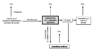 Respecto al ciclo del carbono, la mayoría de este elemento entra a los ecosistemas vía fotosíntesis, los depósitos de carbono orgánico en el suelo representan un equilibrio dinámico de pérdidas y ganancias que se afectan por procesos erosivos, oxidación, humificación y escorrentía, como se puede ver en la figura 1, razón por la cual, el secuestro de carbono se da principalmente en aquellos sistemas que aportan altas cantidades de biomasa, mejoran la estructura del suelo, aumentan la actividad y la diversidad de fauna edáfica y propician mecanismos de ciclaje (Lal, 2004a)