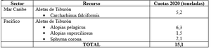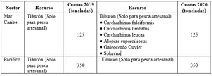 Sin embargo, la Resolución 350 de 2019 incluyó en esta ocasión, las especies de tiburones y además especificó la cuota de aletas correspondientes a los especímenes de tiburones mencionados en la cuota global.