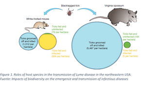 Uno de los ejemplos analizados en el artículo es el de la enfermedad de Lyme, la cual, se transmite a los humanos por la picadura de una garrapata infectada de patas negras (Ixodes scapularis) Las garrapatas inmaduras pueden adquirir la infección si se alimentan de un huésped infectado y pueden volverse infecciosas para los humanos si posteriormente sobreviven a la siguiente etapa de la vida. Los ratones de patas blancas son abundantes en los bosques del noreste de Estados Unidos y se alimentan de muchas garrapatas. Las garrapatas que intentan alimentarse de las zarigüeyas de Virginia probablemente sean lamidas y asesinadas. En la Figura 1 se puede visualizar el impacto de la biodiversidad en la proporción de individuos infectados, los círculos verde y amarillo muestran el número medio de garrapatas por hectárea que se alimentan de ratones o zarigüeyas. El sombreado amarillo muestra la proporción de garrapatas infectadas después de la alimentación. Los círculos azules muestran el número medio de garrapatas por hectárea que son lamidas y asesinadas. Las garrapatas que se alimentan de ratones tienen una alta probabilidad de infectarse con la bacteria que causa la enfermedad de Lyme, mientras que las que se alimentan de zarigüeyas no, como consecuencia, esta especie huésped infecta una alta proporción de las garrapatas dentro de las comunidades forestales. El ratón de patas blancas también es una especie ecológicamente resistente, presente tanto en comunidades ricas como comunidades pobres. En contraste, las zarigüeyas de Virginia son hospederos pobres para el patógeno, mata a la gran mayoría de las garrapatas que intentan alimentarse de ellas, y están ausentes de muchos fragmentos forestales de baja diversidad y degradados, bosques donde abundan los ratones. Por lo tanto, a medida que se pierde la biodiversidad, el hospedero con un fuerte efecto de amortiguación, la zarigüeya, desaparece, mientras que el hospedero con un fuerte efecto amplificador, el ratón, permanece.